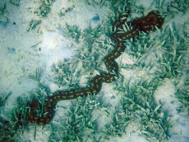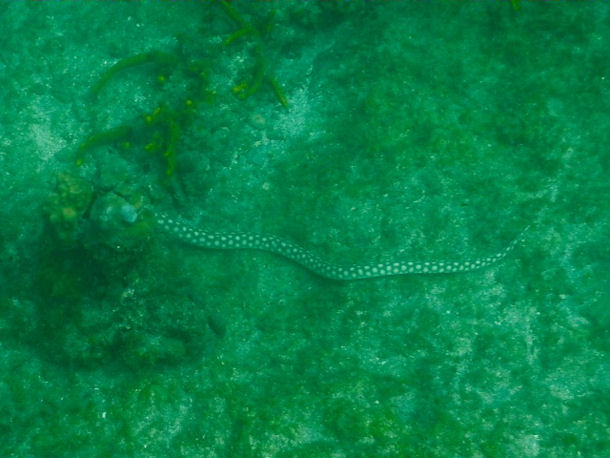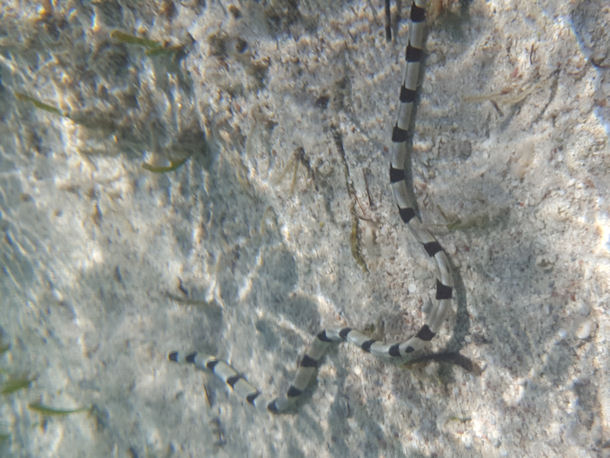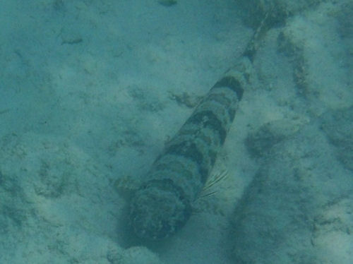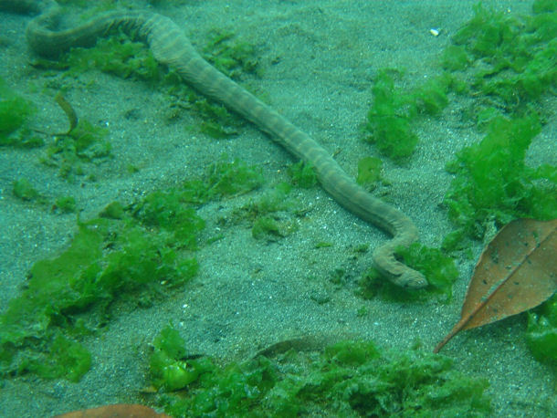 Hallo, ich habe diese Schlange in der Secret Bay im Norden Balis beim Tauchen in etwa 5 m Tiefe gesehen. Weder Basispersonal noch Tauchguides konnten mir sagen, um was für eine Art es sich hierbei handelt.