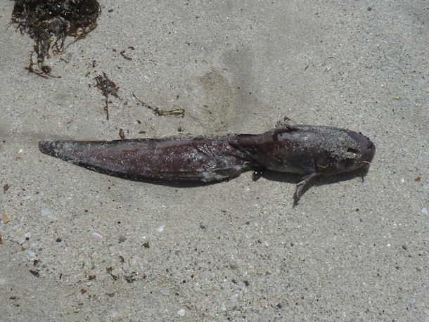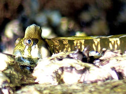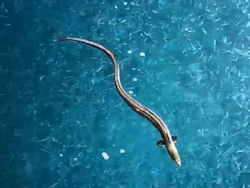 Sehr geehrte Damen und Herren, mein Name ist Anna. Ich bin ein totaler Schnorchel-Neuling. Im Urlaub auf der Insel Kythira (griechische Insel zwischen dem Peleponnes und Kreta) habe ich in Strandnähe (1-2m vom Strand entfernt, ca. 50-80 cm Wassertiefe) einen muränen-, schlangen- oder aalartigen Fisch zwischen den Steinen entdeckt. Er war ungefähr 20-30 cm lang und schlängelte sich zwischen den Steinen. Leider gab es einige Wellen, was es für mich (gerade auch als Neuling) schwer machte still zu halten um ein scharfes Foto zu bekommen.