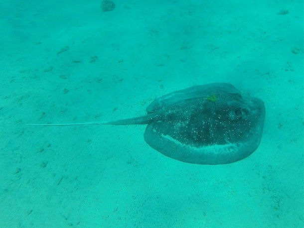 Haben diesen Rochen in der Makadi Bay, Ägypten angetroffen. War ziemlich tief, hat jedenfalls einen Stachel am Schwanz und viele kleine weiße Punkte. Sehr hoch und breit.