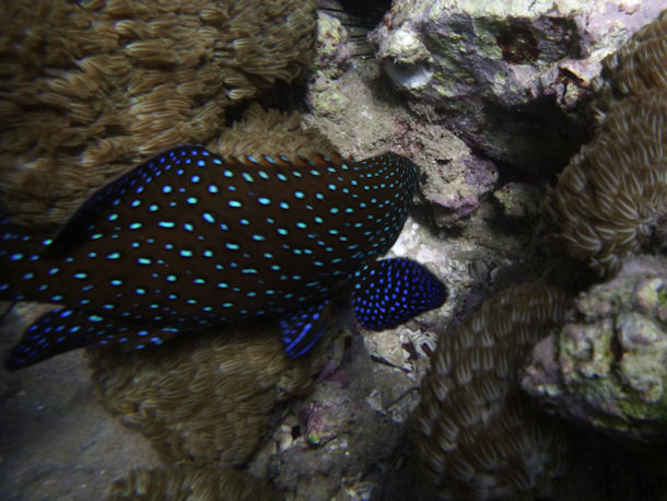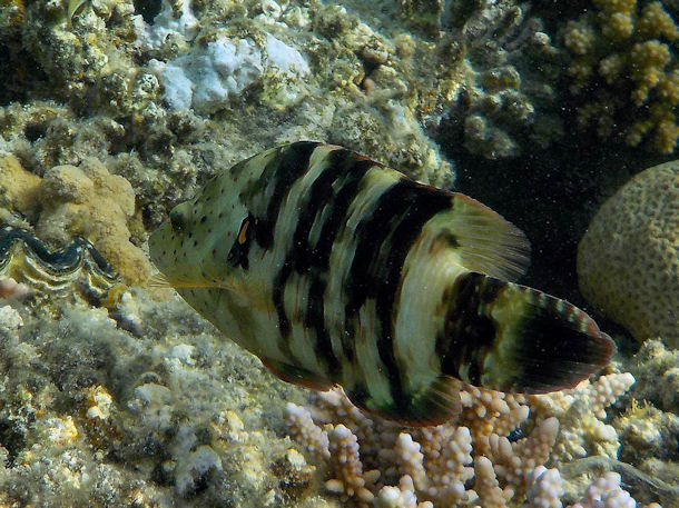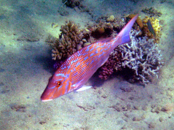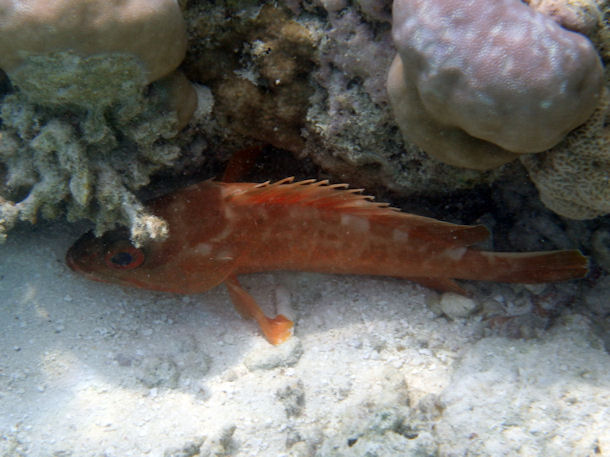 Der ca. 20 cm große "Rötling" sucht bei Annäherung Schutz unter Korallen und sieht auf den ersten Blick wie ein Stachelbarsch aus, jedoch die Schwanzflossen verwirren mich.