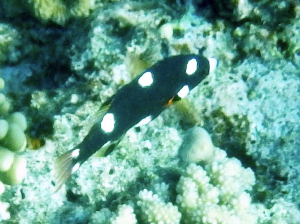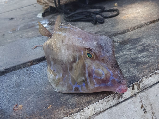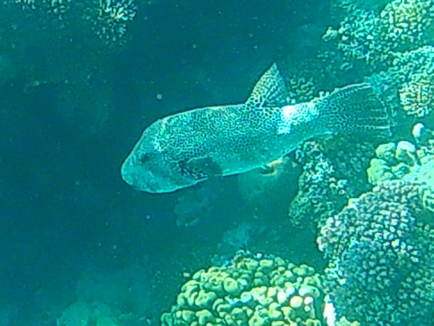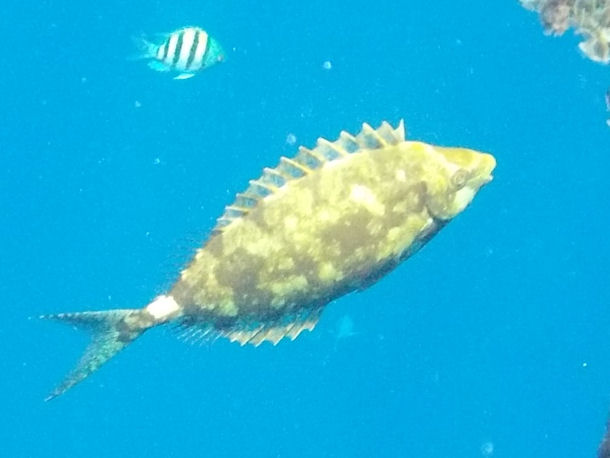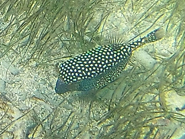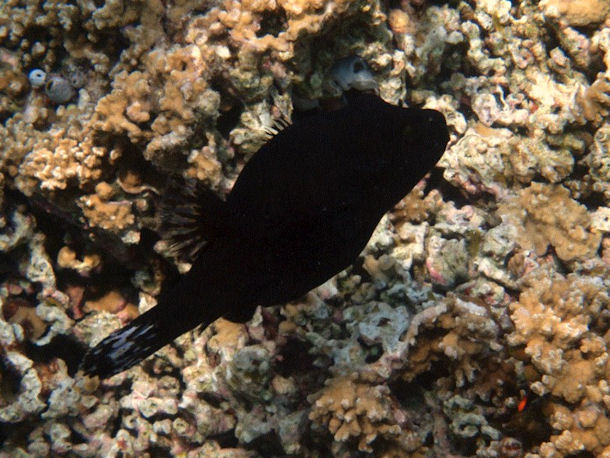 Der Fisch war nicht sehr groß (ich schätze mal 8-10cm) und ziemlich scheu. Markantestes Merkmal ist ein großer Dorn, den er offenbar bei Gefahr aufstellt und der ansonsten nach hinten heruntergeklappt ist. [...]