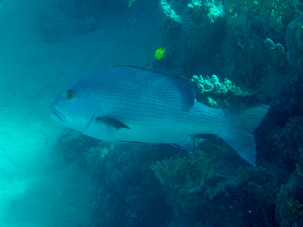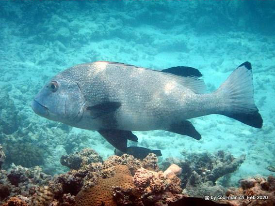 Hallo Freunde von EASYDIVE24, habe dieses Jahr im März wieder und auch 2016 und 2017 in der Bucht von Villa (St. Vincent & the Grenadines) folgenden eindrucksvollen und nicht kleinen Fisch (ca. 50 cm lang) beim Schnorcheln gesehen. Wäre Ihnen sehr dankbar, wenn Sie mir sagen könnten welche Fischart es ist.