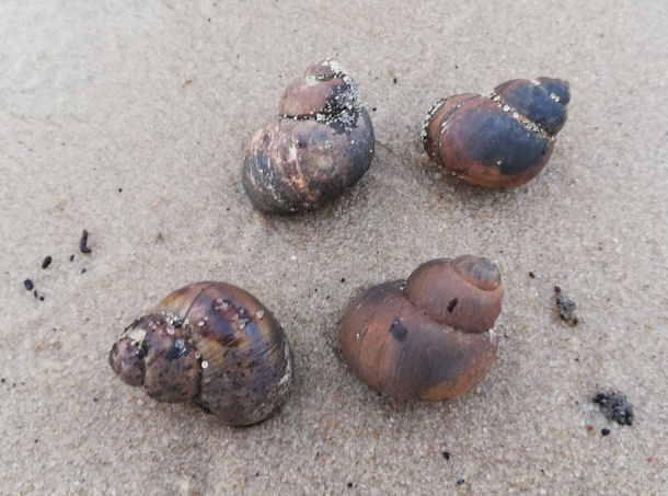 The Dnieper is one of the major rivers of Europe and flowing through Russia, Belarus and Ukraine to the Black Sea. The river is part of the Quagga mussel's native range. The mussel has been accidentally introduced around the world where it has become an invasive species. During my stay in Kiev (Ukraine) I saw some other mussels and molluscs. I'm not an expert and its difficult for me to differ the several species. So, I would be very pleased if you can help me with the identification of the species.