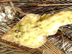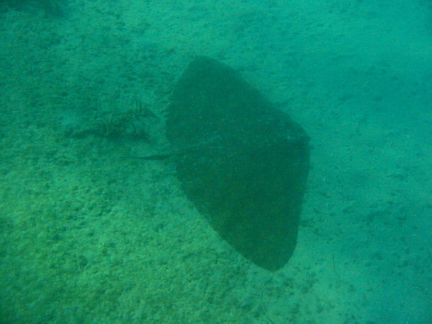 Guten Abend Steven! Anbei noch mal ein paar Fotos: der große Rochen kam in einer Tiefe von 6m aus Richtung Meer angedüst - dachte da schwebt graues Plastik. Dann plazierte er sich unter mir hin und ich schob etwas Panik. Also ruhig auf den Bauch gelegt und beobachtet. Er hatte einen Durchmesser von ca. 2m und der Schwanz war ziemlich kurz. Ich hoffe du kannst es auf den Fotos erkennen.