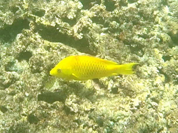 Hallo, selbst diese wunderbare Website hat mir noch nicht weitergeholfen, diesen (momentan?) gelben Fisch zu identifizieren. Ich habe bei vielen Stunden des Schnorchelns auf Mahé, bei Beau Vallon, Riff vor dem Hotel Méridien, eine ziemliche Menge Videoclips und Fotos aufgenommen, sämtlich von der Wasseroberfläche aus, mit GoPro Hero6 und weitem Winkel. Die beigefügte Aufnahme ist ein Einzelbild aus einem Video. Alles, was ich bisher an ähnlichen Fischen in Abbildungen gesehen habe, unterscheidet sich irgendwo deutlich in Farbe, Form oder Muster. Gibt es Ideen?