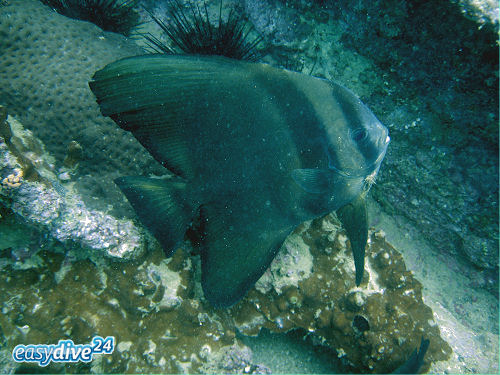 Der Langflossen-Fledermausfisch (Platax teira) gehört zur Familie der Fledermausfische (Ephippidae). Man erkennt ihn an den schwarzen Fleck an der Brust und vor der Afterflosse. Die Flossen sind nur bei Jungfischen wirklich lang ausgezogen. Langflossen-Fledermausfische trifft man in den Lagunen und an den Außenriffen des Roten Meeres und Indopazifiks. Die 60-70 cm langen Fische zeigen wenig Scheu gegenüber Tauchern.