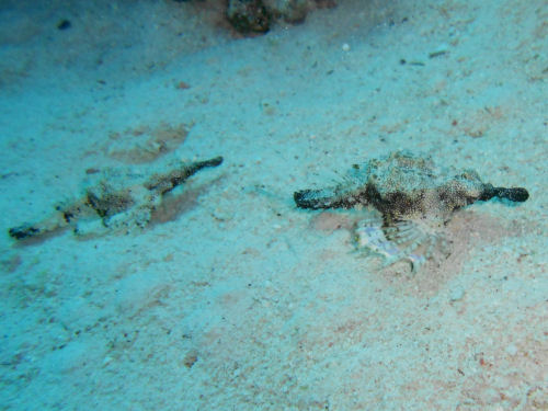 Zwerg-Flügelrossfische (Eurypegasus draconis), auch als Kleines Flügelross oder Kleiner Flügeldrache bekannt, besitzen eine auffällige, lang ausgezogene und röhrenförmige Schnauze und zu Flügeln umgewandelte Brustflossen.