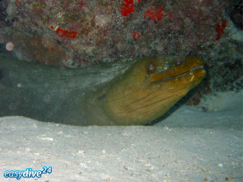 Die bis zu 2,3 m lange Grüne Muräne ist eine der größten Muränenarten. Sie hat eine grüne Färbung, wobei die Tönung individuell variieren kann. Die Grüne Muräne ist nachtaktiv und hält sich tagsüber in Spalten und Höhlen des Riffs auf. Sie kommet von Florida bis Brasilien vor.