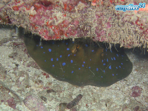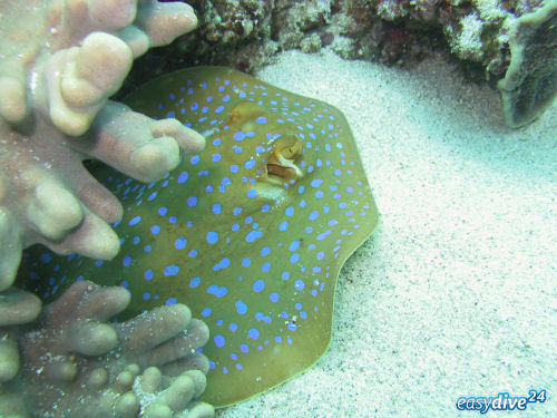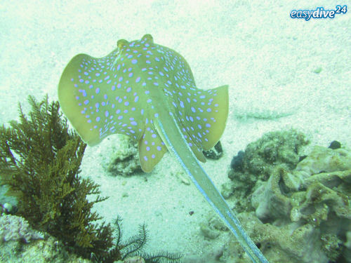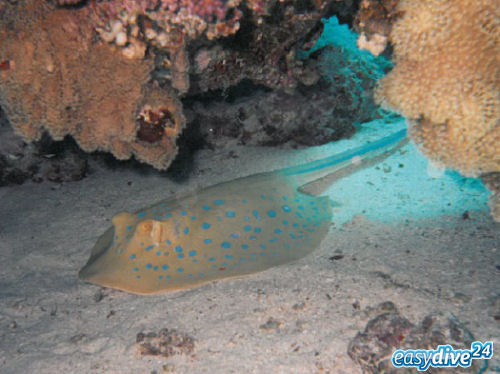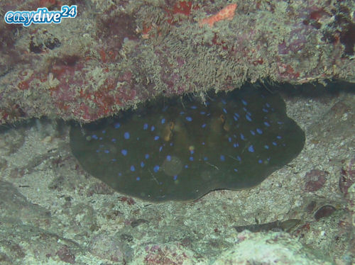 Den Blaupunktrochen (Taeniura lymma), auch Blaupunkt-Stechrochen genannt, gehört zur Familie der Stechrochen (Dasyatididae). Er bevorzugt flache Gewässer in der Nähe von Korallenriffen. Sowohl im Roten Meer, Indischen Ozean als auch Pazifik bis zu den Salomonen ist der Blaupunktrochen recht häufig anzutreffen. Man erkennt ihn sofort an der auffälligen Körperzeichnung: Die Oberseite der flachen Körperscheibe ist mit hellblauen Flecken besetzt. An jeder Schwanzseite befindet sich ein hellblauer Streifen. Er hat zwei Stacheln nahe der Schwanzspitze.