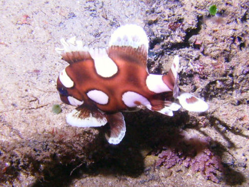 Harlequin sweetlips (Plectorhinchus chaetodonoides), also known as Clown sweetlips or Spotted Sweetlips, is a saltwater fish that actually changes colors over its lifetime. The juvenile Harlequin sweetlips has a brown or tan base covered with large white spots with darker margins and have a lot of similar characteristics as a Clownfish. As the Harlequin Sweetlips grows older its whole body turns white, and it develops black dots.