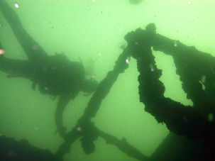 Vor der Alten Fischerei von Altenhof liegt in 33 m Tiefe das Wrack eines versunkenen Fischerboots auf dem schlammigen Grund des Werbellinsees. Der Lichtkegel meiner Lampe wanderte über einige Kisten und Fischernetze. Das Wrack ist fast vollständig im Schlamm versunken. Es schaut nur noch ein Teil der Bordwand hervor. Die Schiffsschraube war freigelegt und deutlich zu erkennen. Sie ließ sich noch drehen.