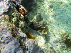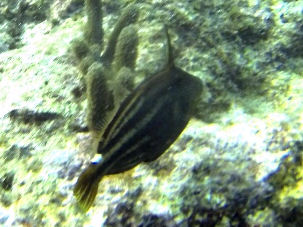 Der Fisch war nicht sehr groß (ich schätze mal 8-10cm) und ziemlich scheu. Markantestes Merkmal ist ein großer Dorn, den er offenbar bei Gefahr aufstellt und der ansonsten nach hinten heruntergeklappt ist.