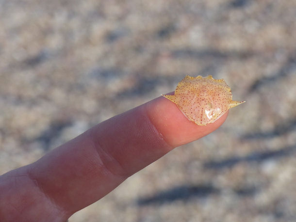das ist der abgestoßende Panzer einer Krabbe. Krabben und andere Krustentiere wie Krebse haben harte Hautpanzer, die sie während ihres Wachstums in regelmäßigen Abständen abwerfen und durch größere ersetzen.