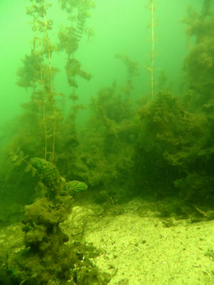 Bereits wenige Meter vom Ufer entfernt beginnt ein schöner, dichter Pflanzengürtel. Es dominiert prächtiges Hornblatt und Ähriges Tausendblatt. Die feingefiederten Stängelblätter reichen manchmal bis dicht unter die Wasseroberfläche. Insbesondere im Gegenlicht bietet sich dann ein schönes botanisches Panorama. Häufig trifft man auf große und mittlere Hechte, die im dichten Pflanzengürtel auf Beute lauern.