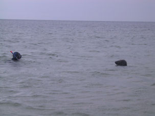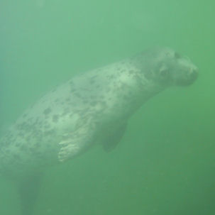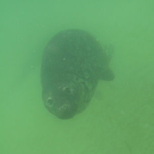 Wir zogen unsere Neoprenanzüge an und gingen ins Wasser. Obwohl Mitte Juli war das Wasser eiskalt und die Sicht ziemlich schlecht. Etwa 100 m vom Ufer entfernt schnorchelten wir über eine große Kelpwiese. Ab und zu schwamm eine Kompassqualle vorbei. Sie ist das Wappentier der Biologischen Anstalt Helgoland. Dann plötzlich umkreisten uns die schwarze Silhouetten der Robben, wobei sie den Radius von mal zu mal verringerten. Zunächst näherte sich ein ausgewachsener Bulle, dann auch die kleineren Weibchen. Ein paar Mal schwammen neugierige Robben direkt vor die Taucherbrille, doch ehe ich ein vernünftiges Bild aufnehmen konnte, waren sie schon wieder verschwunden. Irgendwann hatten sich die Tiere jedoch an unsere Anwesenheit gewöhnt und verloren ihre anfängliche Scheu. Die Robben kamen bis auf Armlänge heran, bissen und zogen an den Taucherflossen und begannen sogar unsere Bewegungen nachzuahmen. Wenn man sich duckte, drehte oder wendete – sie machten alles nach. Es fiel schwer,