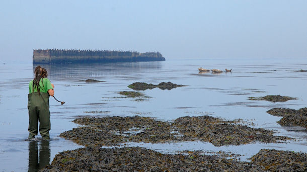Die Robben teilen sich das Eiland mit rund 1.600 Menschen und unzähligen Seevögeln, die zu Hunderten um die „Lange Anna“, dem Wahrzeichen der Insel, herumschwirren. Noch mehr lassen sich nur wenige Schritte davon auf dem Lummenfelsen nieder, dem kleinsten Naturschutzgebiet der Welt. Seinen Namen verdankt der Lummenfelsen der Trottellumme, die hier neben Basstölpeln und Tordalken ihre Brutplätze hat. Auf den schmalen Vorsprüngen der steilen Klippen brüten Tausende der schwarz-weißen Vögel mit dem lustigen Namen. Die kleinen Trottellummen sind wahre Helden: Um den räuberischen Möwen zu entkommen, stürzen sich die Jungvögel nach Einbruch der Dämmerung vom Klippenrand ins Meer. In diesem Stadium können sie noch nicht fliegen, so dass sie schwimmend versuchen, vor Tagesanbruch die Möwen so weit wie möglich hinter sich zu lassen. Die Angsthasen unter ihnen werden von ihren Eltern in die Tiefe geschupst. Der allabendliche Lummensprung kann auf Helgoland von Juni bis Juli beobachtet werden.