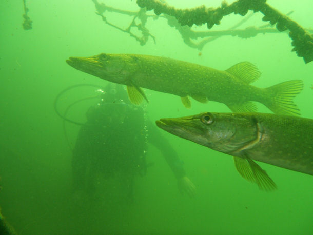 Zu sehen sind neben großen Hechten, Barschen, Aalen, Plötzen, Rotfedern und dicken Bleien mehrere hölzernde Wracks und zwei Flugzeugzusatztanks. Gleich neben der alten Stadtmauer von Strausberg befindet sich die Tauchbasis 1ATauchen.