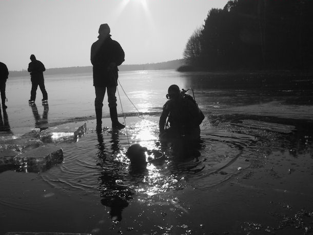 Strahlend blauer Himmel, Sonnenschein und eine herrliche Winterlandschaft betteten die eisbedeckte "Katja" ein. Wird das Eis uns tragen? Schnell stürzten wir zum Ufer und stellten fest, dass man - anders als noch beim Weihnachtstauchen am 15. Dezember - gefahrlos über´s Eis schlittern konnte. Zunächst einmal mussten aber zwei Löcher ins Eis gesägt werden. Bei der 15 cm dicken Eisschicht war das eine schweißtreibende Arbeit! Dann kam aber das schwierigste Unterfangen: die Schollen herausheben. Kaum war das Loch fertig, machten sich schon die einzig wirklich Tapferen, die Nasstaucher bereit. Insbesondere die zuvor abgesprochenen Leinensignale wurden noch einmal wiederholt.