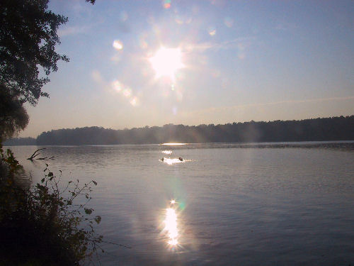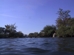Über weite Strecken war die Spree stark verkrautet, so dass es hieß Bauch einziehen. Wir schwammen entlang des Schilfgürtels teils durch Wasserlinsenteppiche, besser bekannt als Entengrütze. Unter schattigen Überhängen suchten wir nach Welsen, die es hier eigentlich recht häufig geben soll. Welse sahen wir zwar nicht, dafür aber große Bleie, Barsche und erstmals große Döbel, deren langgestreckte, torpedoförmige Körper ein auffälliges, netzartiges Schuppenmuster aufweisen. Die Fische können über einen halben Meter lang werden.