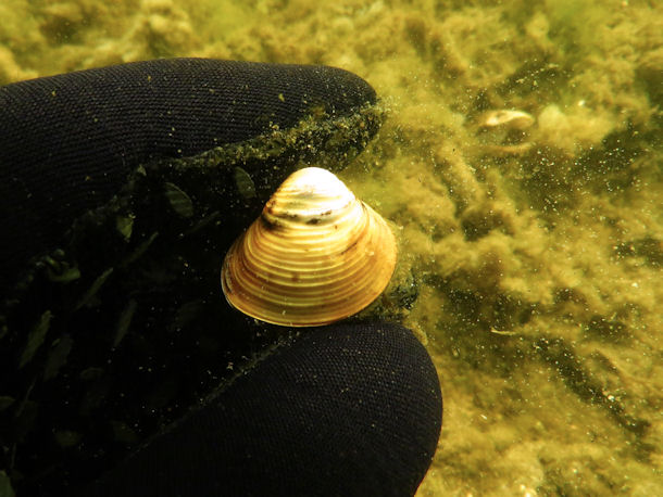 In den vergangenen Jahren tauchen immer neue fremdländische Arten auf und verdrängen die heimische Tierwelt. Bei einem Tauchgang im Werlsee entdeckte ich kleine gelbe Muscheln mit rundlich dreieckiger Schalenform, die ich bisher noch nie gesehen hatte. Es handelte sich um Asiatische Körbchenmuscheln, die Ende der 1980iger Jahre aus Südostasien eingeschleppt wurden und sich seitdem rasant ausbreiten.
