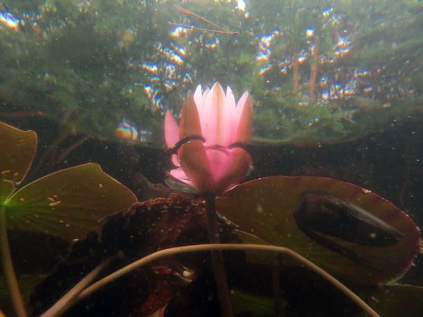 Da wir nur mit einem Auto angereist sind und einen langen Rückweg im Tauchanzug die Straße entlang scheuen, schwimmen wir zunächst flussaufwärts gegen die Strömung an. Der Blick unter die Wasseroberfläche eröffnete eine herrliche Welt mit Süßwasserschwämmen, große Flussmuscheln und selten gewordenen Fischarten. Die Wasserpflanzen bewegten sich im Rhythmus der Strömung.
