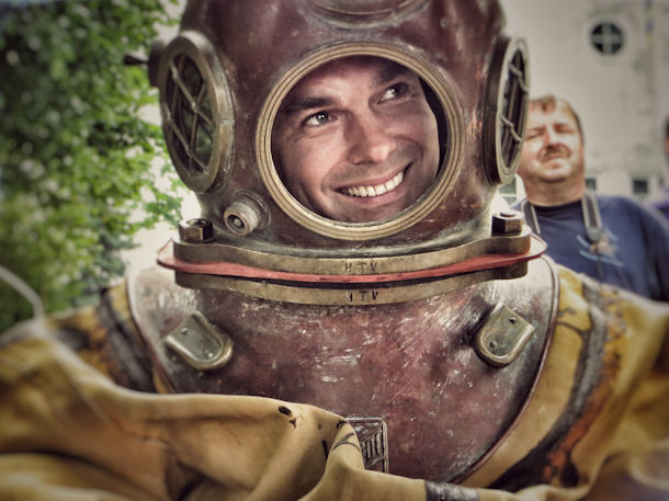 Helmtauchen auf dem Grund der Dahme Bereits zweimal war der Helmtaucherverein Rostock e.V. zu Besuch beim Tauchsportklub Adlershof im ProSport 24 e.V. und präsentierte seine historische Helmtauchausrüstung. Interessierte Taucher konnten die Möglichkeit nutzen, vor dem Vereinshaus der Berliner Taucher einen Rundgang auf dem Grund der Dahme zu wagen.