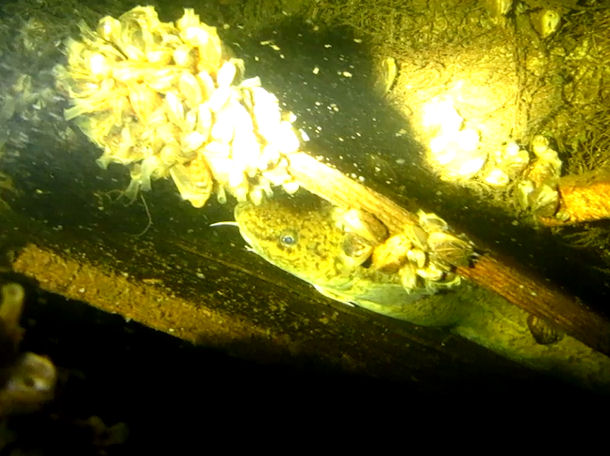 Nur einige Hundert Meter vor der Alten Fischerei von Altenhof liegt das Wrack eines versunkenen Fischerboots auf dem schlammigen Grund des Werbellinsees. Der Lichtkegel meiner Lampe wanderte über einige Kisten und Fischernetze. Das Wrack ist fast vollständig im Schlamm versunken. Es schaut nur noch ein Teil der Bordwand hervor. Die Schiffsschraube war freigelegt und deutlich zu erkennen. Sie ließ sich noch drehen. Das Wrack liegt auf 33 m Tiefe. Dort unten ist es kalt und stockdunkel. Zum Untergang ist leider sehr wenig bekannt, Es wird berichtet, dass das Boot im Frühjahr 1974 gesunken sein soll. Damals sollen zwei Fischer entgegen den Anweisungen des damals zuständigen Bereichsleiters bei starkem Wind auf den See gefahren sein. Das Boot, das ohne Sicherungseinrichtung und Schwimmkörpern ausgestattet war, sei durch hohen Wellengang voll Wasser gelaufen und schnell untergegangen. Beide Fischer verloren bei dem Unglück ihr Leben.