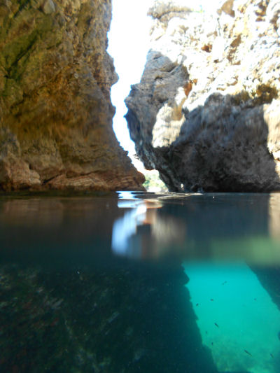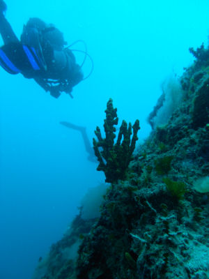 Eine senkrecht abfallende Steilwand, die bis auf 40 Meter ins bodenlose abzufallen scheint, führt zum Canyon. Mit etwas Glück kann man hier große Thunfischschwärme beobachten.