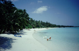 Im März verbrachten Collin, der seit Anfang des Jahres Mitglied unseres Klubs ist, und ich eine Woche auf der Malediven-Insel Kuramathi. Die am südlichen Rand des Rashdoo-Atolls gelegene Insel ist mit hohen, schlanken Kokospalmen bewachsen. Undurchdringlicher Bewuchs im Inselinneren macht den zusätzlichen Reiz dieser Insel aus. Dort befinden sich die Schlafplätze der Indischen Flughunde, die eine beeindruckende Flügelspannweite von 1,20 m erreichen. Die Insellage am Atoll-Außenriff ist günstig für Tauchgänge in den strömungsreichen Pässen, wo man häufig auf Großfische treffen kann. Hier erlebten wir den Tanz der Mantas...