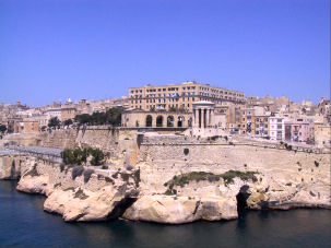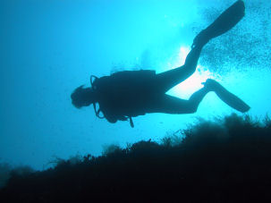 Hier leben Seesterne, Seegurken, Röhren- und Borstenwürmer, sowie Schwärme von Brassen und Mönchsfischen. Gegen Mittag rauhte die See auf, so dass das Essen auf dem Boot sehr magenstrapazierend war. Um dem zu entgehen, flüchteten wir ins Wasser. Ich schnorchelte und machte Unterwasserfotos von Quallen mit über einem Meter langen Tentakeln. Tina rettete sich auf einen Felsen. Endlich ging es weiter zum nächsten Tauchplatz, dem Blue Dome, einer großen Unterwasserhöhle, deren Zugang sich unter der Meeresoberfläche befindet. Wir tauchten in der Höhle auf. Die einzige Lichtquelle waren die durch den unterseeischen Höhleneingang eindringenden Sonnenstrahlen, die das Wasser darum im herrlichsten Azurblau erleuchten ließen. Einfach toll... Während der Rückfahrt zur St. Paul´s Bay sahen wir sogar einen fliegenden Fisch.