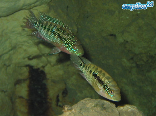 Direkt beim Einstieg im sonnendurchfluteten Cavernbereich fällt eine große Menge von Lebengebärenden Zahnkarpfen auf, bei denen es sich um Gambusia yacatana bzw. den Spitzmaulkärpfling Poecilia sphenops handeln könnte. Die Fische sind mit 3 bis 5 cm recht klein. Sie sind ständig damit beschäftigt, den Algenaufwuchs von den Steinen zu picken. Des Weiteren sind Guatemala-Antennenwelse (Rhamdia guatemalensis bzw. Rhamdia quelen) und Buntbarsche anzutreffen. Es dürfte sich bei den Buntbarschen um die Arten Amphilophus robertsoni handeln. Die Buntbarsche der Art Astatheros robertsoni stehen zumeist paarweise zusammen im Tageslichtbereich. Sie sind etwa 10 cm groß. Ich konnte auch Tiere von Rocio octofasciata aufspüren. Die Fische zeichneten sich durch stark
