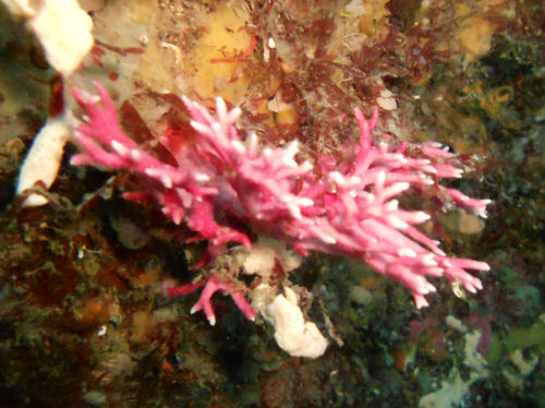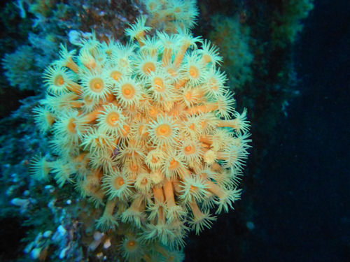 Dann gehts per Rolle rückwärts ins Wasser. Das Wasser ist eisigkalt. Die Felswände fallen hier steil ins Meer weshalb es schon wenige Meter vom Ufer sehr tief ist. Langsam tauchen wir an der Felswand hinab und durchtauchen schnell die Grenze zwischen Süß- und Salzwasser, die bei ein bis zwei Meter Tiefe liegt. Die beeindruckende Landschaft geht auch unter Wasser weiter. Die Unterwasserwelt ist karg und steinig - das macht sie aber so besonders. Die Felsen sind von großen Kolonien Gelber Krustenanemone (Parazoanthus sp.) überzogen, dazwischen ab und zu ein Vasenschwamm oder eine Rote Koralle.