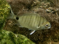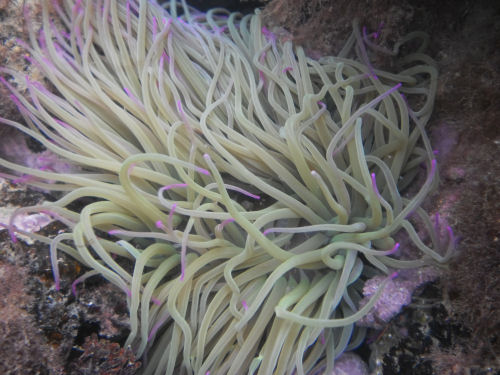 Am Strand von La Ribera ging ich ins Wasser. Aufgrund der geschützten Lage ist das Meer hier ruhig und die Sicht gut. Das Wasser ist aber recht frisch, denn an der Küste Ceutas mischt sich das Wasser des Atlantiks mit dem des Mittelmeeres. Dies wiederum beschert uns Tauchern eine abwechslungsreiche Flora und Fauna. Aufgrund der Temperaturunterschiede beschlug mein neuer Unterwasserfotoapparat und ich konnte leider nur wenige Fotos machen. Mir fielen bereits nach den ersten Minuten die vielen violetten Seeanemonen auf. Streifen-Brassen, Meeräschen, Meerjuncker und Meerpfauen huschten an meiner Maske vorbei. Letztere zu den Lippfischen gehörende Fische mit ihrer charakteristischen Kopfzeichnung sind besonders farbenfroh. Auf grünlichem oder rötlichem Grund leuchten blaugrüne Bänder, die Augen und Lippen umfassen und sich bis in die Gegend der Brustflosse ziehen.