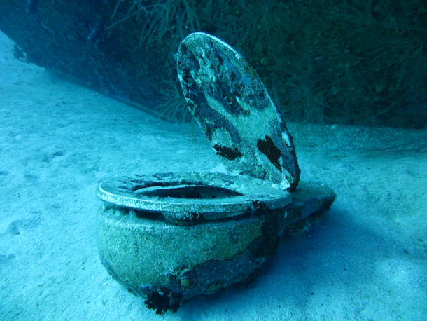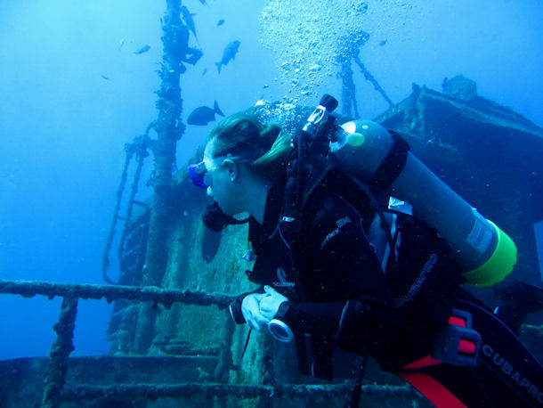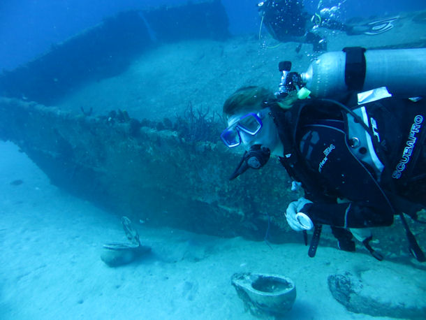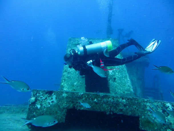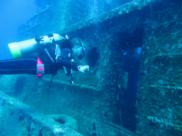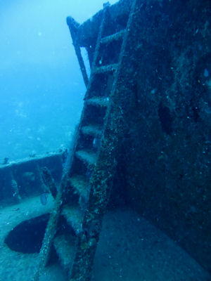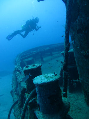 Nur wenige Flossenschläge hinter den beiden Wracks hat der U.S.Army Schlepper Beata seine letzte Ruhe gefunden. Auch dieses Schiff wurde als künstliches Riff versenkt.