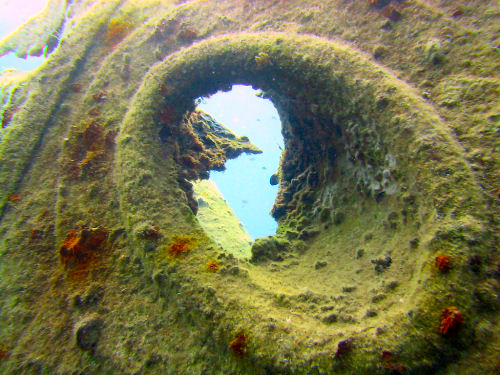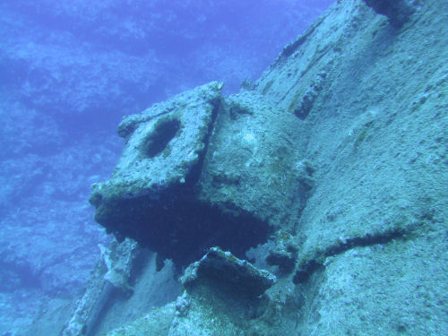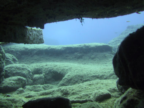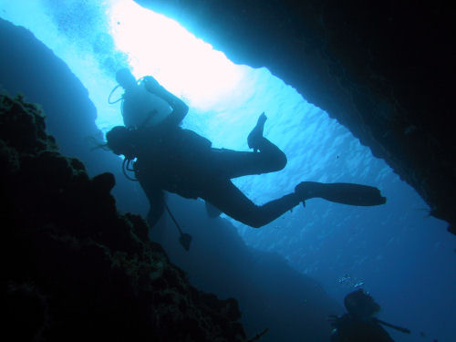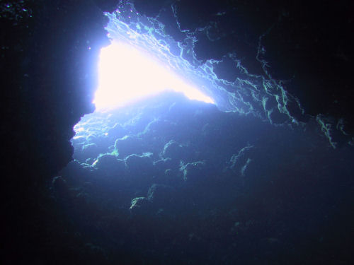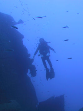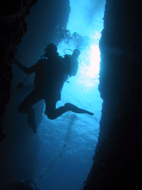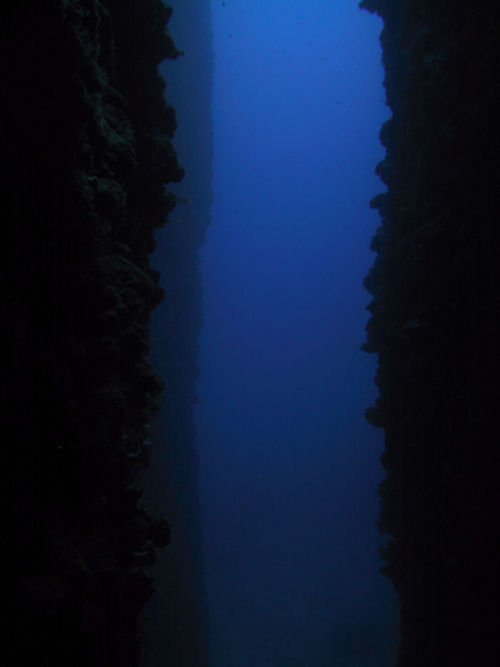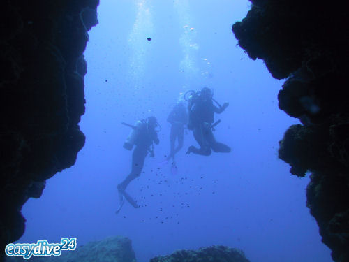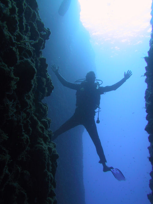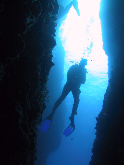 Auf dem Rückweg kann man entweder direkt durch den Canyon zurück und wirft dabei noch einmal einen faszinierenden Blick auf das Wrack. Oder man taucht ein Stück weiter nach links und kann dort durch einen Tunnel und einen sehr schmalen Kamin, durch den immer nur ein Taucher passt, auf ungefähr 14 m wieder aufsteigen. Anschließend kann man noch an der Kante des Plateus austauchen und dann geht es wieder zum Boot zurück. Ein Top-Tauchplatz!
