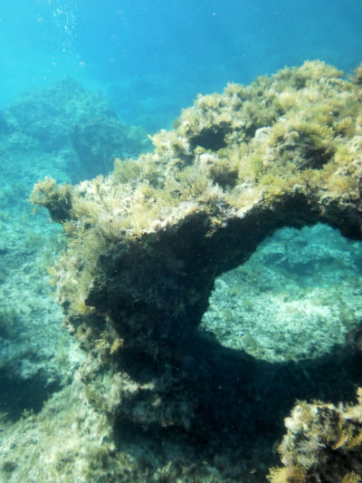 Die interessanten Felsformationen setzen sich unter Wasser fort. Man schwimmt vorbei an großen Steinformationen und erreicht in 15 - 20 m Tiefe eine große Seegraswiese. Im Freiwasser jagen Bernstein-Stachelmakrelen und Barrakudas durch Schwärme kleinerer Fische und über dem Seegras patroulieren etwa 1 m lange Flötenfische. In Höhlen und unter Felsvorsprüngen verstecken sich rote Kardinalsfische und Soldatenfische. Auch Muränen, Zackenbarsche und Oktopusse sind hier anzutreffen. Bei Sichtweiten von 20 m taucht man entlang an 20 m hohen, senkrechten Felswänden. Es ist ein wirklich schöner Tauchplatz mit der typischen Mittelmeerflora und –fauna.