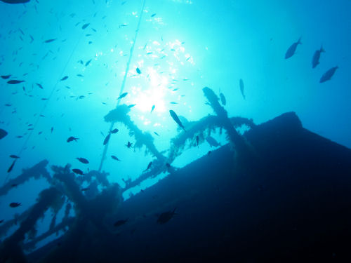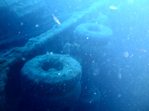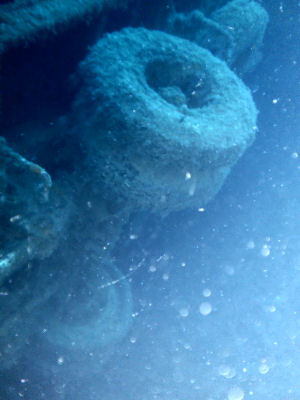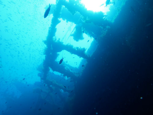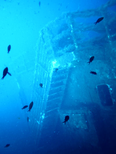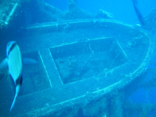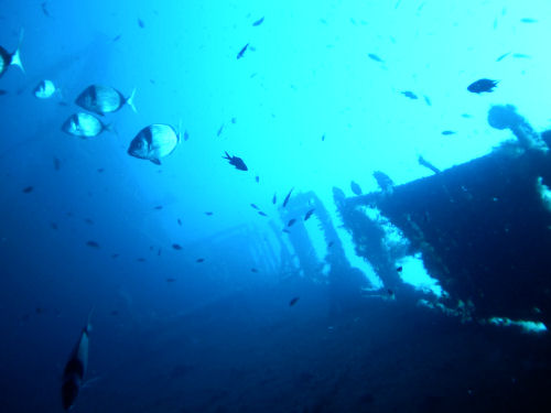 Im Inneren des Schiffs soll man dann auf dem unteren Ladedeck auf eine Vielzahl von Lkw´s stoßen. Beim ersten Tauchgang wollte ich jedoch noch nicht ins Innere des Wracks eindringen, sondern mir zunächst ein Bild vom Tauchplatz machen. Bereits nach einer halben Stunde Tauchzeit musste ich meinen Aufstieg zurück an die Oberfläche beginnen. Zwar hatte ich eine 15 l Flasche auf dem Rücken, doch viel zu schnell gelangt man hier in die Deko-Zeit.