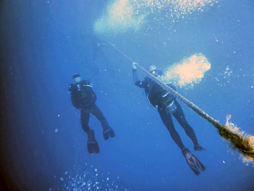 Ich tauchte vorbei an Treppen und Aufgängen, an einem Rettungsboot und erreichte nach 45 min Tauchzeit wieder die Reling, an der das Seil zur Oberfläche befestigt war.