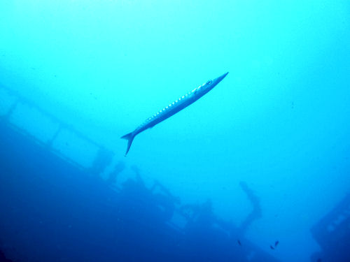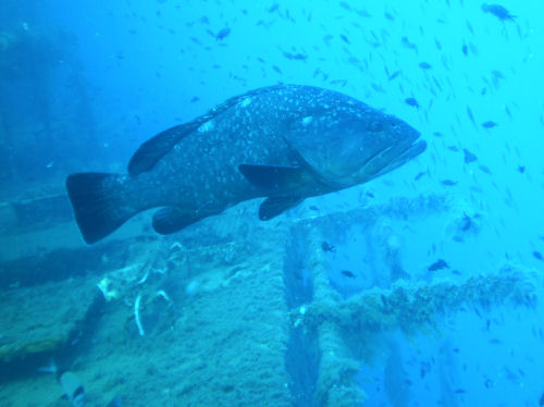 Ich tauchte dann in 34 m Tiefe entlang der Heckklappe und erreichte das offene, obere Ladedeck im hinteren Teil des Schiffes. Hier liegen mehrere Lkw´s über die große Zackenbarsche patroulierten.