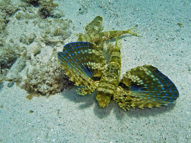 Ich habe noch ein Exemplar fotografiert wo ich mir nicht sicher bin..evtl. ein Art Drachachenkopf? Das einzige was sich an dem Fisch bewegt hat, war das Maul. Ansonsten lag er einfach nur da und ließ sich durch nichts und niemanden stören. Er lag zwischen Steinen und Muscheln und fiel mir nur durch die rosa Schwanzflosse auf.