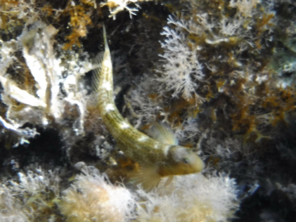 Sehr geehrte Damen und Herren, mein Name ist Anna. Ich bin ein totaler Schnorchel-Neuling. Im Urlaub auf der Insel Kythira (griechische Insel zwischen dem Peleponnes und Kreta) habe ich in Strandnähe (1-2m vom Strand entfernt, ca. 50-80 cm Wassertiefe) einen muränen-, schlangen- oder aalartigen Fisch zwischen den Steinen entdeckt. Er war ungefähr 20-30 cm lang und schlängelte sich zwischen den Steinen. Leider gab es einige Wellen, was es für mich (gerade auch als Neuling) schwer machte still zu halten um ein scharfes Foto zu bekommen.