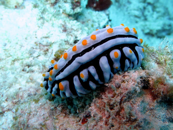 Berghia (1), Bornella (1), Caloria (1), Ceratosoma (1), Chromodoris (5), Cratena (1), Cyphoma (1), Doriprismatica (1), Elysia (1), Favorinus (1), Felimare (2), Flabellina (1), Goniobranchus (6), Halgerda (2), Hypselodoris (6), Jason (1), Jorunna (1), Nembrotha (5), Peltodoris (1), Phyllidia (6), Phyllidiella (2), Phyllidiopsis (1), Platydoris (1), Pleurobranchus (2), Polycera (1), Risbecia (1), Thuridilla (1)