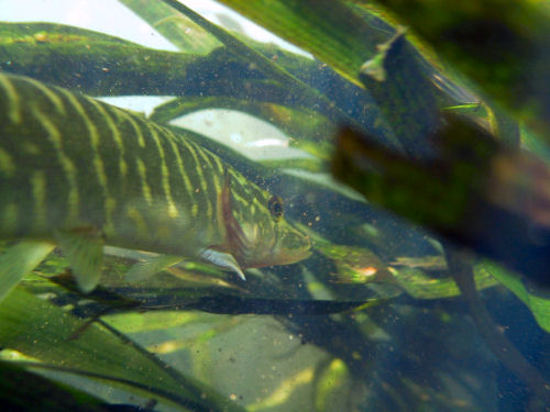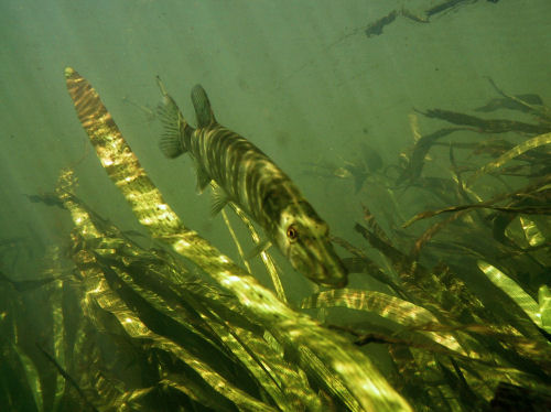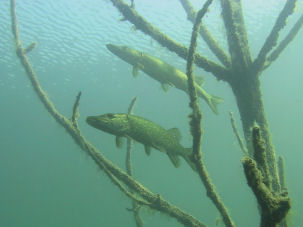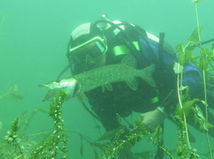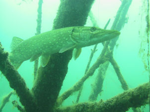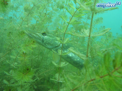 Der Hecht ist für Taucher der Süßwasser-Raubfisch schlechthin. Er gehört zu den am weitesten verbreiteten Fischen Mitteleuropas. Der Hecht hat einen markanten, langgestreckten Körper mit großer, entenschnabelförmiger Schnauze. Sein weites Maul ist mit nach hinten gebogenen Zähnen besetzt. Ähnlich wie Haie haben Hechte ein Revolvergebiss – wenn ein Zahn ausbricht, rückt ein neuer nach.