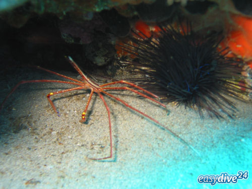 Die Ostatlantik-Pfeilkrabbe (Stenorhynchus lanceolatus), auch als Atlantische Spinnenkrabbe bekannt, lebt an den Küsten der Kanarischen Inseln und Madeiras. Um sich vor Fressfeinden zu schützen ist sie oft in der Nähe langstacheliger Seeigel anzutreffen.