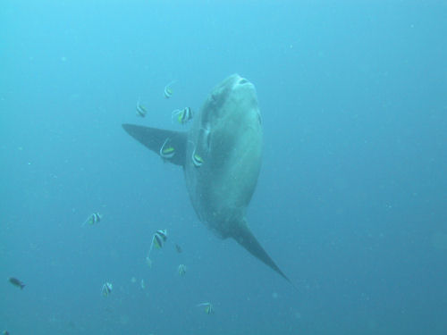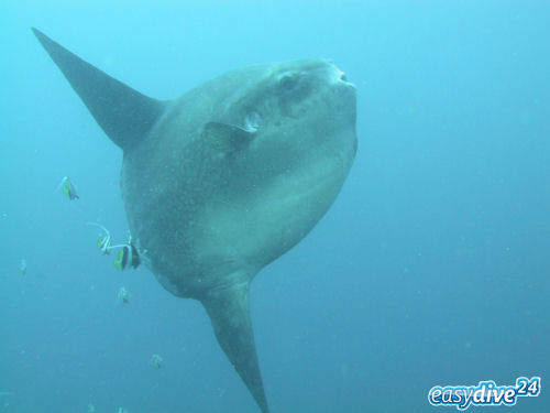 Mondfische können eine Körperlänge von etwa 3 Metern, eine Höhe von fast 4 Metern und ein Gesamtgewicht von über 2 Tonnen erreichen! Sie sind damit die größten Knochenfische der Welt. Laut Guinness-Buch der Rekorde wurde sogar einmal ein Riesenexemplar von 4,26 Metern und 2,235 Tonnen gefangen. Mondfische gehören zur Familie der Kugelfische, obwohl die Körperform weniger einer Kugel sondern eher einem Mühlstein ähnelt. Daher rührt auch der zoologische Name Mola mola (lat. mola = Mühlstein).