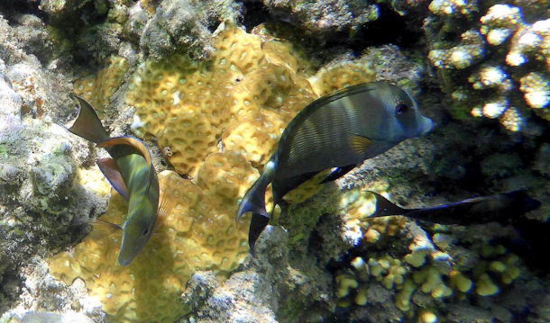 Es handelt sich um einen Doktorfisch. Aufgrund der Perspektive ist die Artbestimmung gar nicht so einfach. Ich würde sagen, dass es um Gelbflossen-Doktorfische Acanthurus xanthopterus handelt.