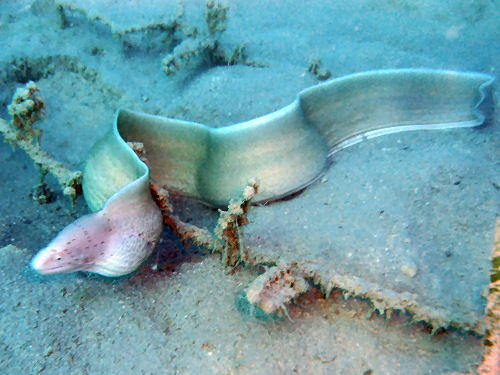 Während sich auf dem Sandboden zahlreiche Blaupunktrochen verstecken, bevölkern den Rumpf eine Vielzahl farbenprächtiger Nacktschnecken. Die Arten wechseln alle Monate, sind aber immer recht zahlreich. Man kann hier schöne Exemplare wie die gelbgefleckten Prachtsternschnecken Risbecia pulchella und Goniobranchus annulatus beobachten, die sich auf dem ersten Blick sehr ähneln. Doch während die Grundfärbung der G. annulatus komplett weiß ist, besitzt die R. pulchella ein Muster aus 'verschmierten' lila Flecken und Linien. Weiterhin fehlt ihr der charakteristische purpurrote Ring um die Kiemen und Fühlerpaare der G. annulatus.