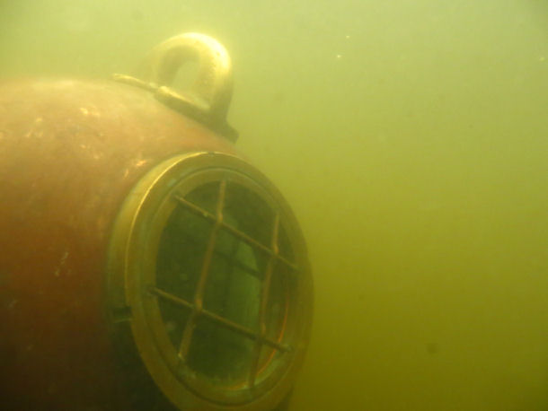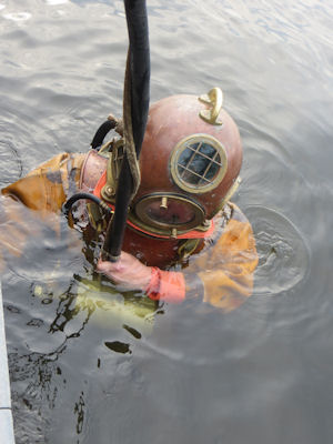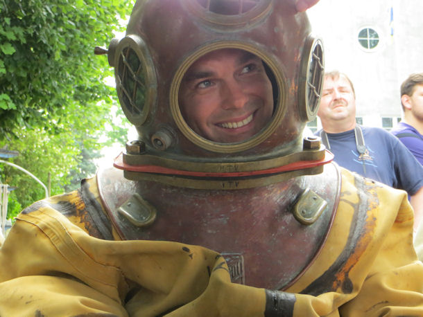 Ausprobieren der Helmtaucherausrüstung