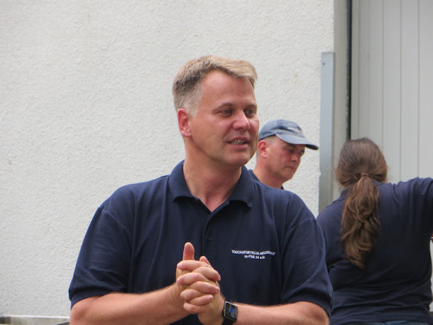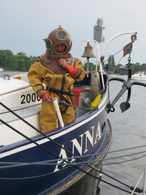 Nach den Eröffnungsreden begann der „Aktiv-Teil“. Mitglieder des Helmtauchervereins Rostock e.V. hatten ihre schwere, historische Tauchausrüstung mitgebracht und ermöglichten allen Interessierten einen Tauchgang auf dem Grund der Dahme. Tauchgang ist hier wörtlich zu nehmen. Denn das Tragen der fast 80 kg schweren Rüstung außerhalb des Wassers, und die Fortbewegung dieser Masse beim Gehen unter Wasser, ist äußerst kräftezehrend. Eine Stärkung nach dem Unterwasserspaziergang an Grill und Bar war glücklicherweise gesichert. Viele fleißige Hände halfen beim Grillen und Bierzapfen.