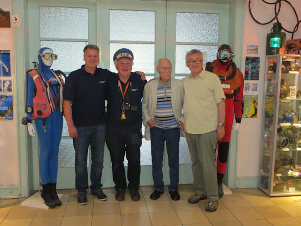 Das Programm wurde durch Schlauchbootfahrten für die Kinder sowie Drachenbootfahrten abgerundet. Otmar Richter – zünftig mit Museumswärtermütze – führte durch das Sporttauchermuseum und konnte auch wieder neue Exponate in Empfang nehmen. Die Erweiterung des Museums ist wohl unausweichlich. Im Großen Saal wurde der Film „Zurück in die Heimkehle“ über die spektakuläre Höhlentauchexpedition 1958 in den unterirdischen Thyrasee und deren filmische Redokumentation durch Mitglieder des Tauchsportklubs Adlershof im Jahre 2014 gezeigt.